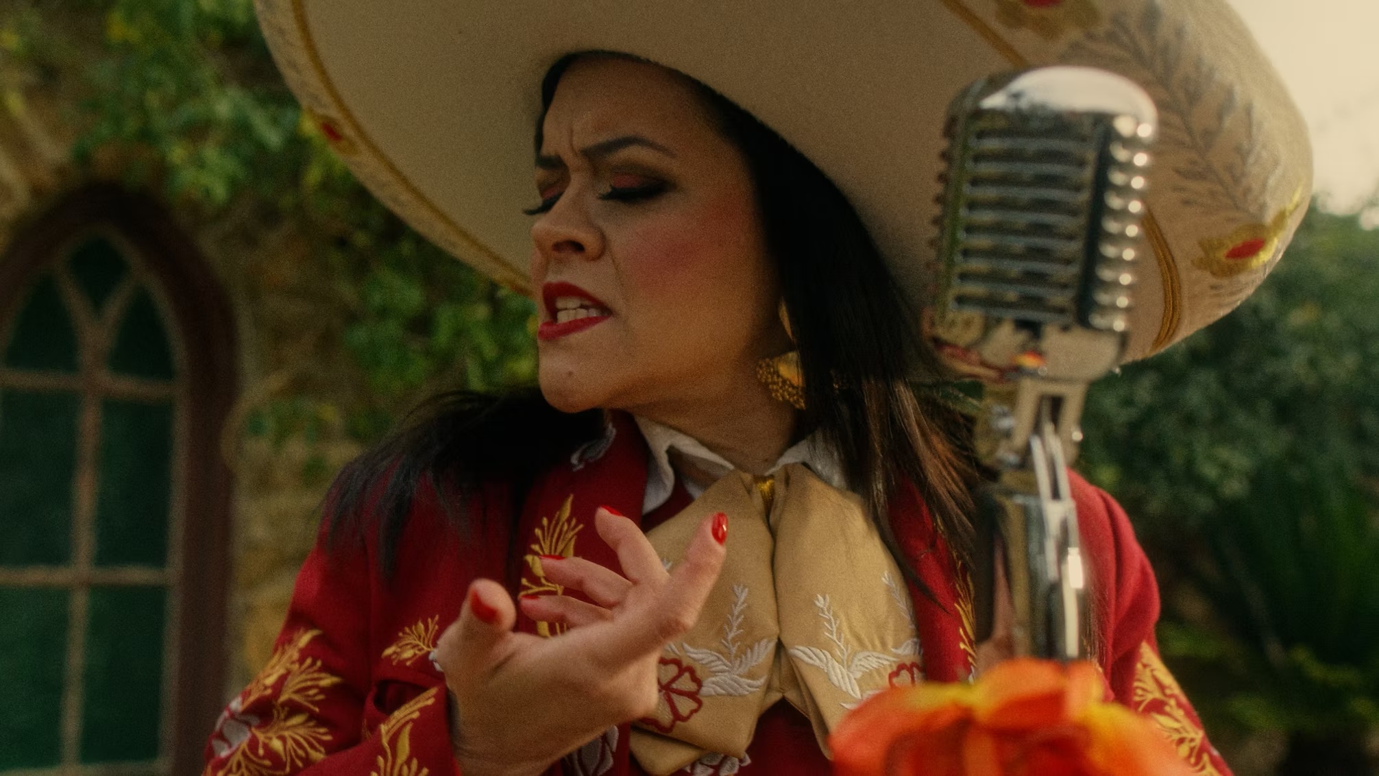 Mariachi singer busking in the street. She's performing to an audience of just one - and that one is our